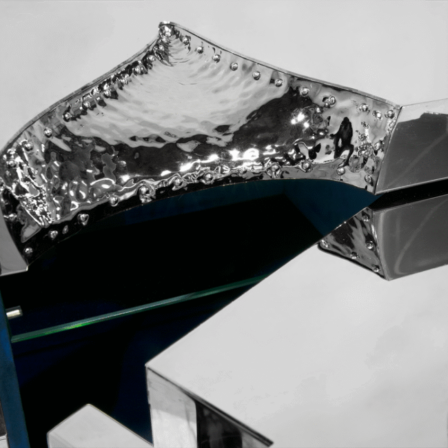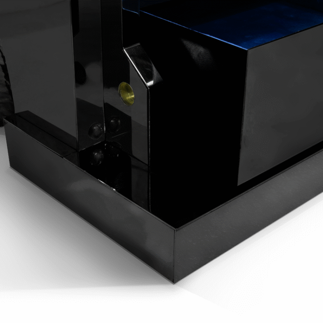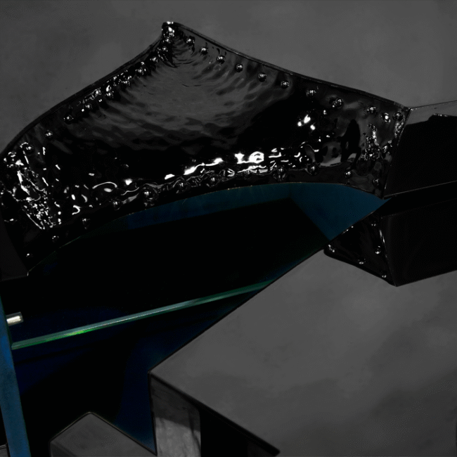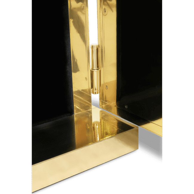 Materials: Wood; Brass; Stainless Steel; Upholstery. Finishes: Glossy black lacquered stainless steel; Glossy black lacquered hammered brass; Gold-plated casted brass; Blue velvet.