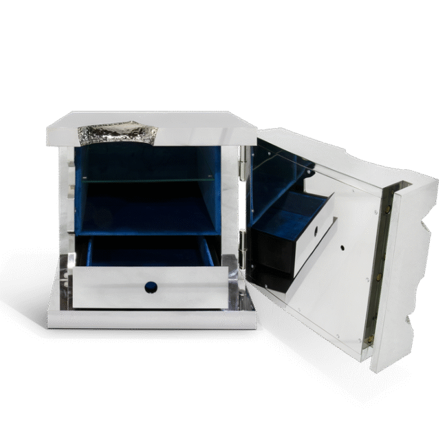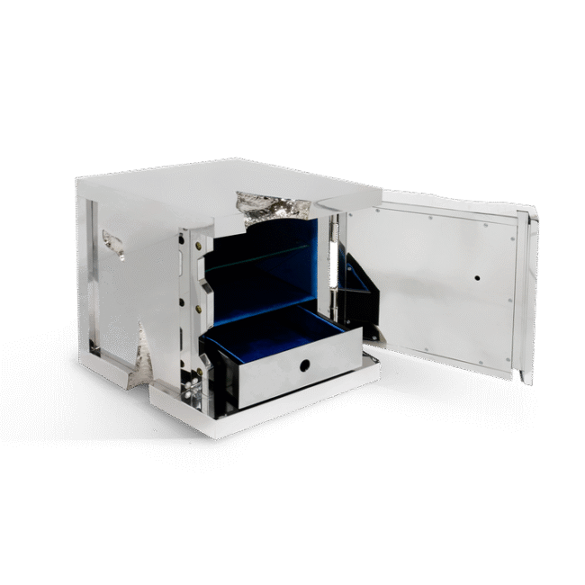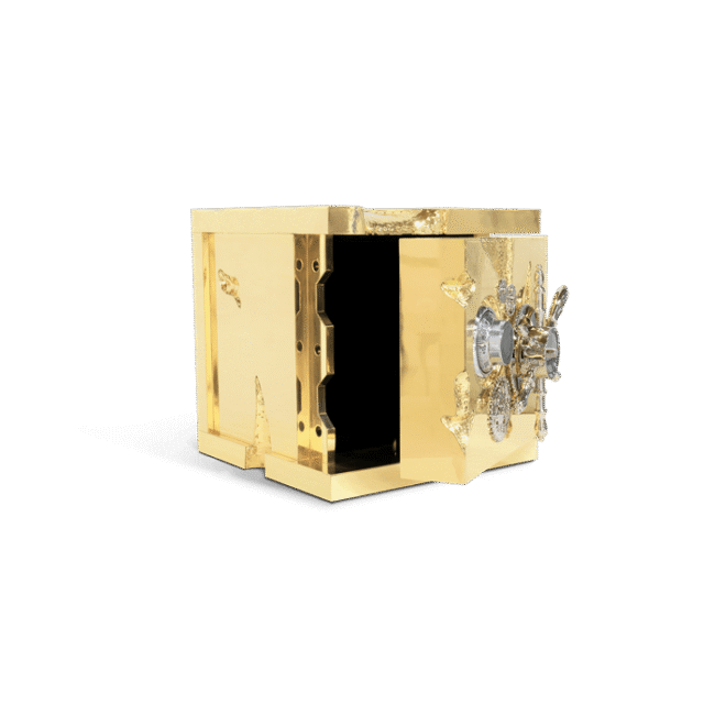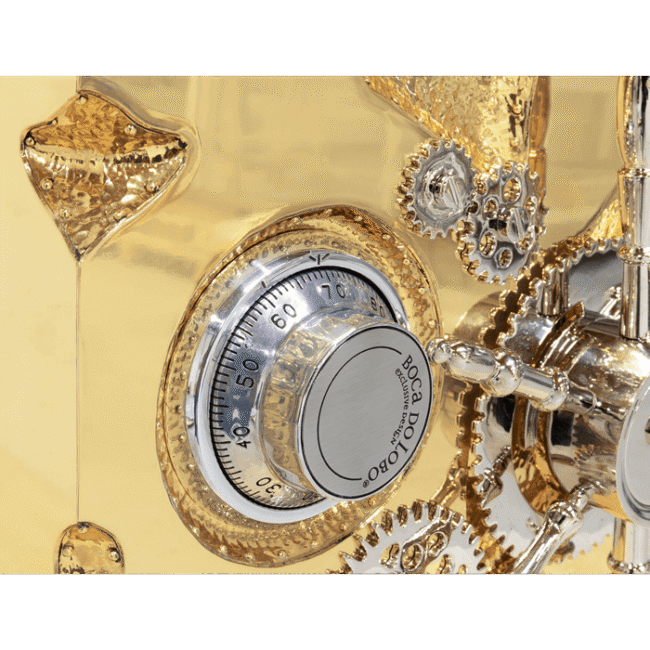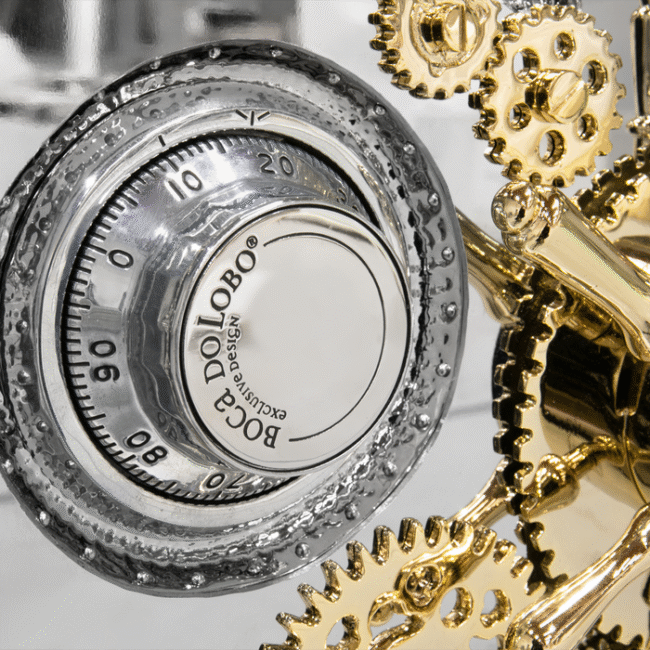 The Millionaire Jewelry Safe – a compact and portable rendition of the iconic Millionaire Safe. Inspired by the allure of the California Gold Rush, this statement piece exudes a captivating charm. Crafted with exquisite materials, and adorned with intriguing dents that evoke tales of the Old West’s vault heists. Its centrepiece is a distinguished safe handle, nestled amidst a gear-wheel mechanism, activated through a secret dial lock combination. The overlay door unveils a lavish interior, offering an exquisite haven for treasured items, making it the ideal storage solution for valuables, accessories, business essentials, or luxury indulgences – all while leaving a lasting impression.