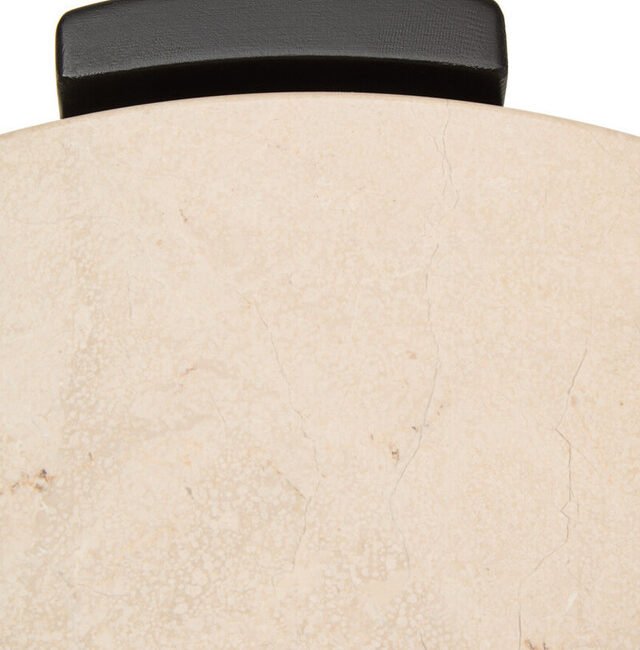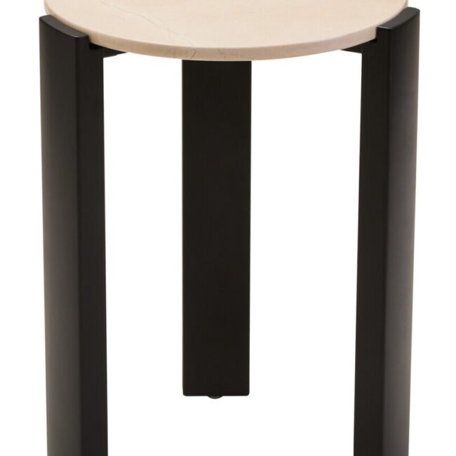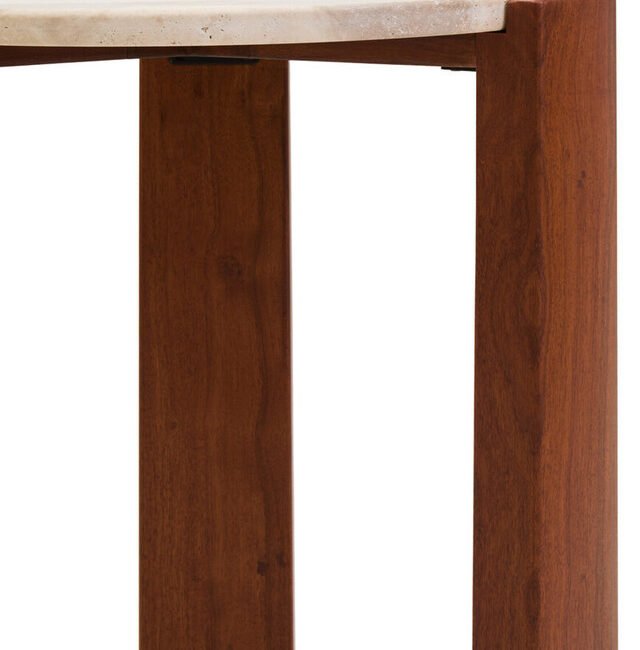 Alero Round Side Table: This round side table features a travertine top that adds a touch of luxury and sophistication. Crafted from natural acacia wood, its sturdy legs offer a balanced and visually appealing design, making it a perfect focal point for both contemporary and classic interiors. The unique appearance of travertine, with its natural colour variations and textures, adds character to any space.