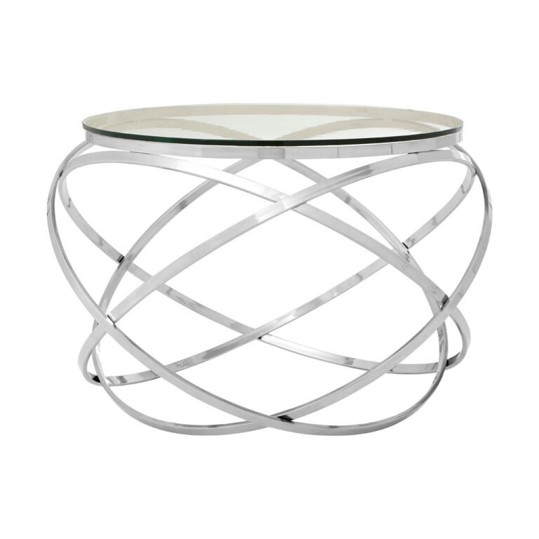 Alia Clear Glass Circular End Table: Its distinctive legs are formed from four large stainless steel hoops that overlap. The polished silver finish makes it highly reflective, and allows it to be coordinated easily with metallic furniture. A fifth, horizontal hoop is positioned at the top as a base for the clear tempered glass tabletop.