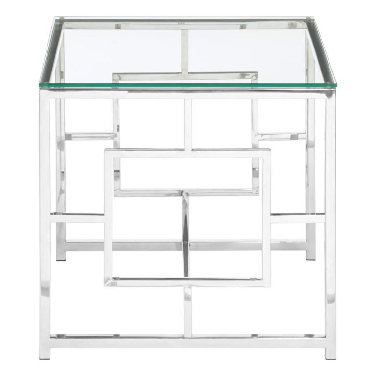 Its simple design lines give this sleek end table a contemporary minimal look. The Alia Clear Glass / Silver Base End Table frame is made from stainless steel, and has a reflective chrome finish with sides that boast a rectangular inset feature. The top is made from tempered glass and has a crystal clear colour. It looks great styled with metallic accessories.