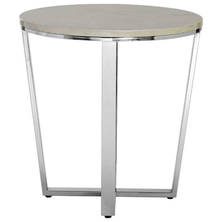 Alia Round White Faux Marble End Table: The Alia end table is notable for its four angled legs that develop a lattice at the base, creating a sense of fluidity. Made from tough metal, their reflective chrome finish makes the table suitable for styling with silver and gold metallics. The faux marble tabletop rests upon a slender chrome base, its muted white finish juxtaposing tonally with the metal.