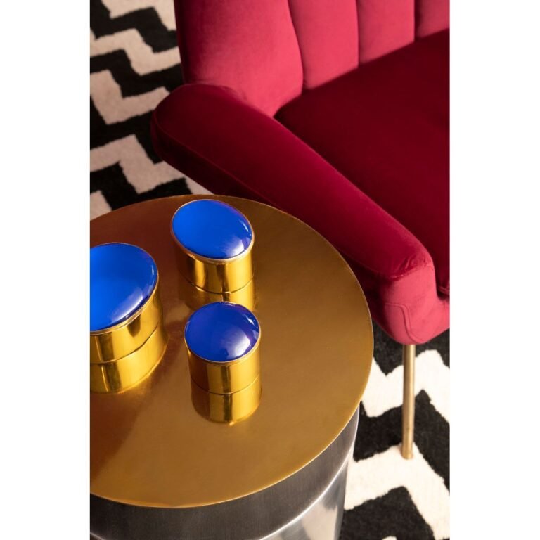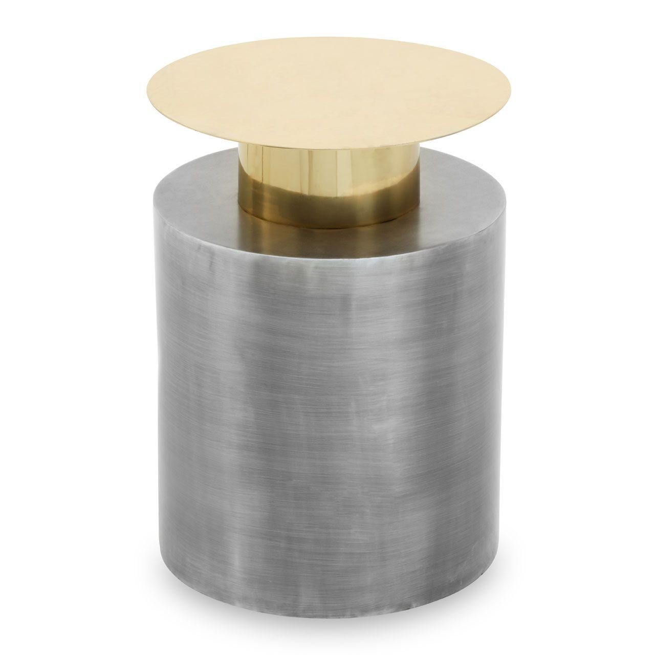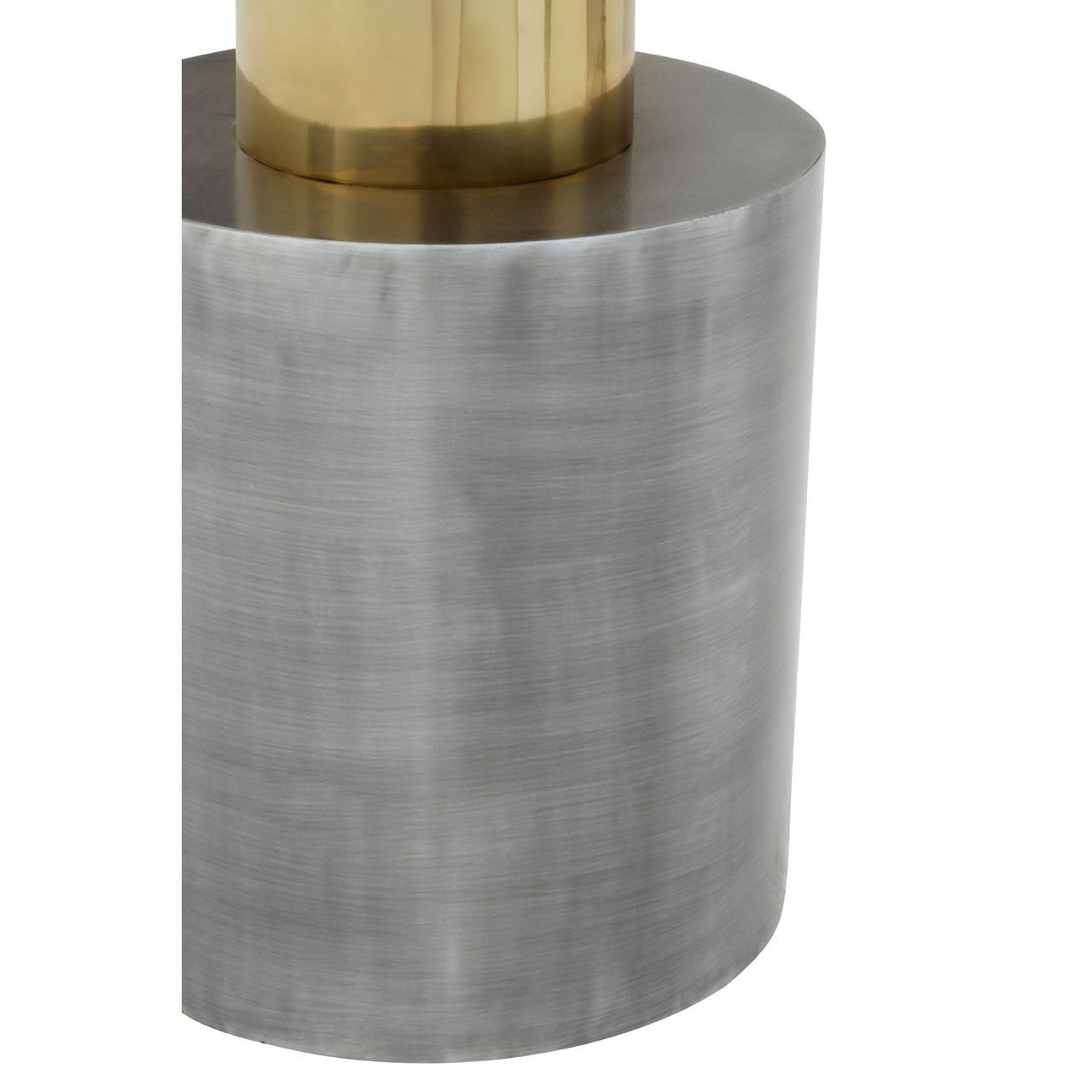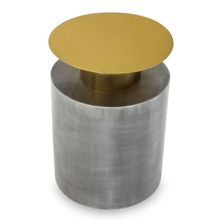 Ambia Accent Table With Straight Base: This accent table’s round top is perched above the pedestal base. This table with a seemingly clean profile boasts a geometric aesthetic in two tonal contrast of warm metallic and antique zinc finish.