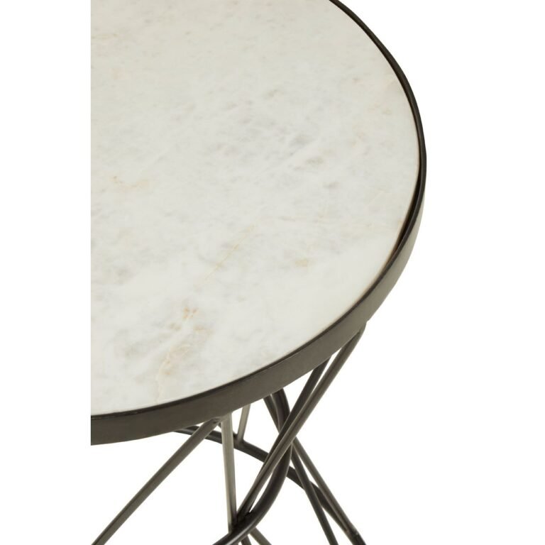 Created from smooth iron, the Ambia Corset Base Side Table features a powdered black finish. Slender metallic wires intertwine and cross to create an intriguing base in an hourglass figure. The table’s round top is formed from smooth white marble, adding a sophisticated touch that lends itself well to luxe style interiors.