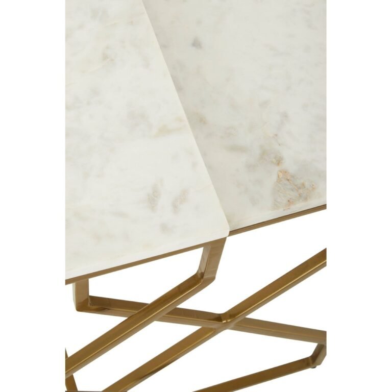 Sleek and slender lines of this Ambia Set Of 2 Nesting Side Tables introduce elegance and simplicity. Antique brass finish lines join to form a cross design base in these contemporary pieces. The warmly accented frames securely hold square shaped white marble tops which give the overall design a muted aesthetic.