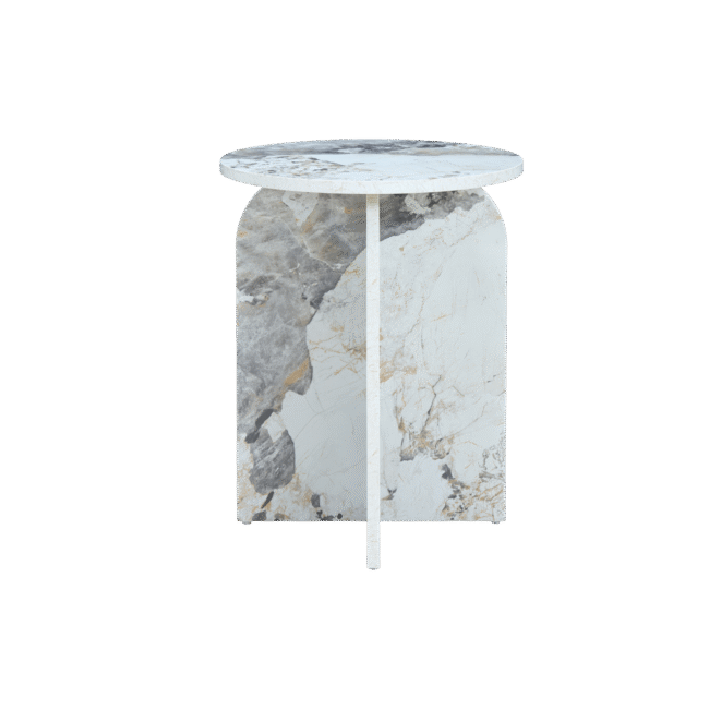 The Arco Side Table has a trendy and dynamic shape with a round top and a gently curved base. Its legs form a plus shape from two pieces which slot seamlessly into each other. Available in black with a woodgrain effect finish or in green and white marble-effect options, this side table offers versatility and style. Thoughtfully constructed with sustainable components, it aligns with eco-conscious living.