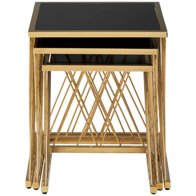 The Arelle nesting tables feature tops made from black tempered glass, set into sleek stainless steel frames. The frames have a gold finish that styles well with the black glass. Diagonal lines create a lattice pattern.