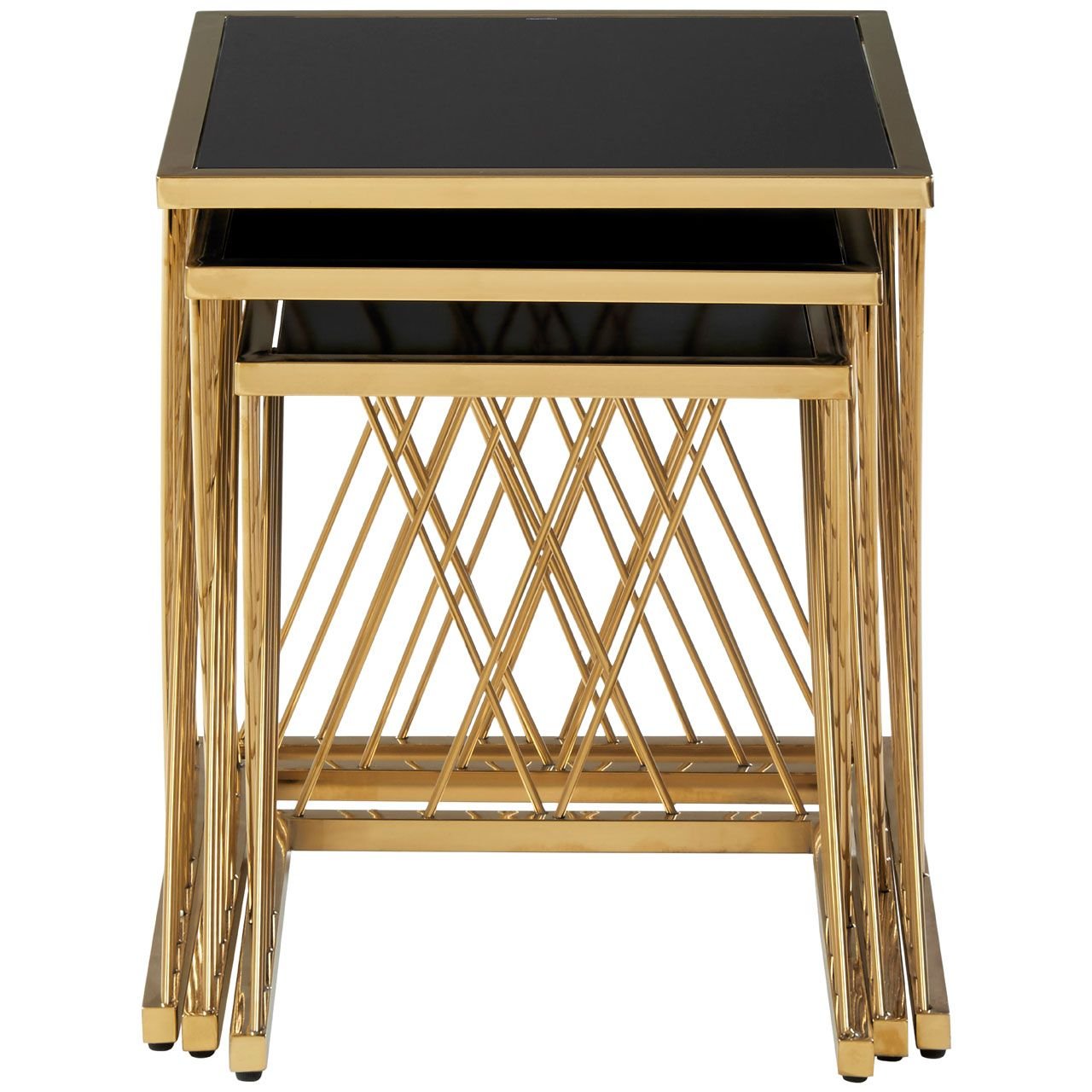The Arezzo nesting tables feature tops made from black tempered glass, set into sleek stainless steel frames. The frames have a gold finish that styles well with the black glass. Diagonal lines create a lattice pattern.