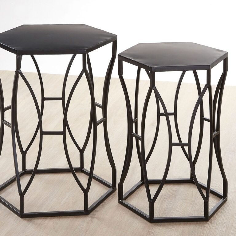 Avery Concave Black Tables: This pair of contemporary tables use tough iron to create decorative symmetrical patterns. Hourglass shapes coalesce with oval motifs beneath the polygonal tabletops and above the polygonal bases. The combined result is a pair of fluid accent pieces that complement industrial style furniture and lighting.