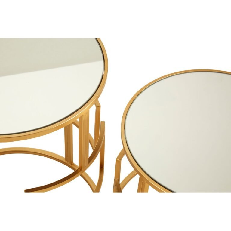 Made from robust metal, these tables feature bold rectangular sections on their rounded base. Each frame is finished in a warm gold shade with openwork design that gives them an airy aesthetic. The round mirrored tops add further reflective appeal. Style them with luxe-inspired furniture and accessories.