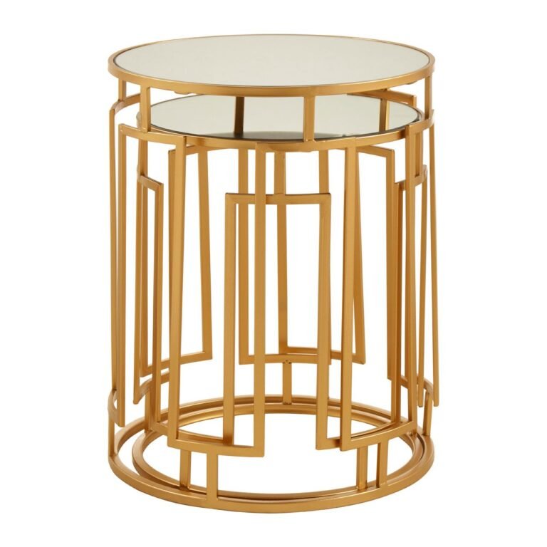 Made from robust metal, these tables feature bold rectangular sections on their rounded base. Each frame is finished in a warm gold shade with openwork design that gives them an airy aesthetic. The round mirrored tops add further reflective appeal. Style them with luxe-inspired furniture and accessories.
