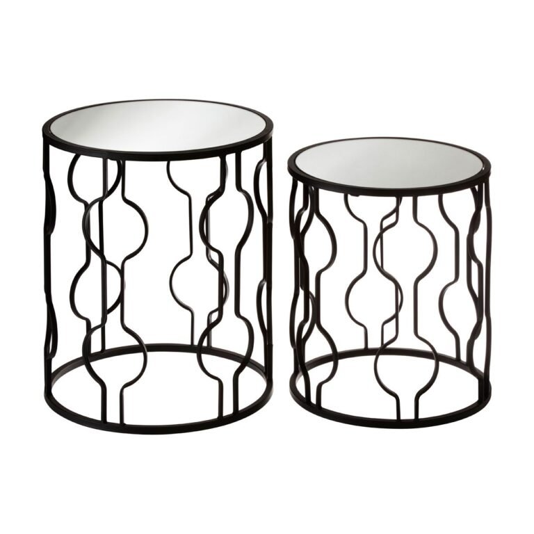 This set of two side tables lends a monochrome accent to contemporary interiors. Their bases are made from smooth iron and the circular patterns give each one a hint of arabesque exoticism. A piece of mirrored glass is set into each round top to introduce a reflective look to their sleek black aesthetic.