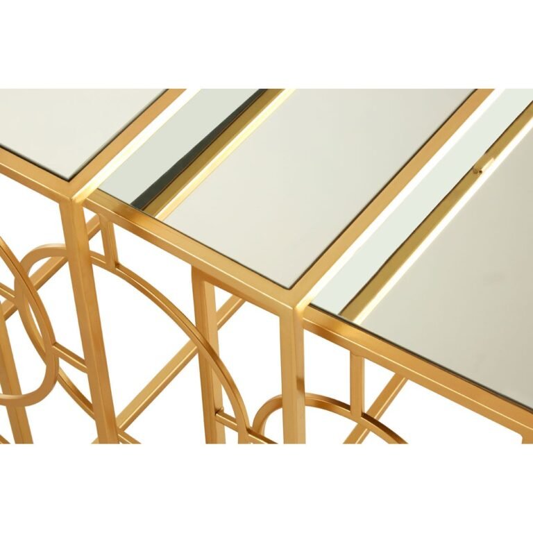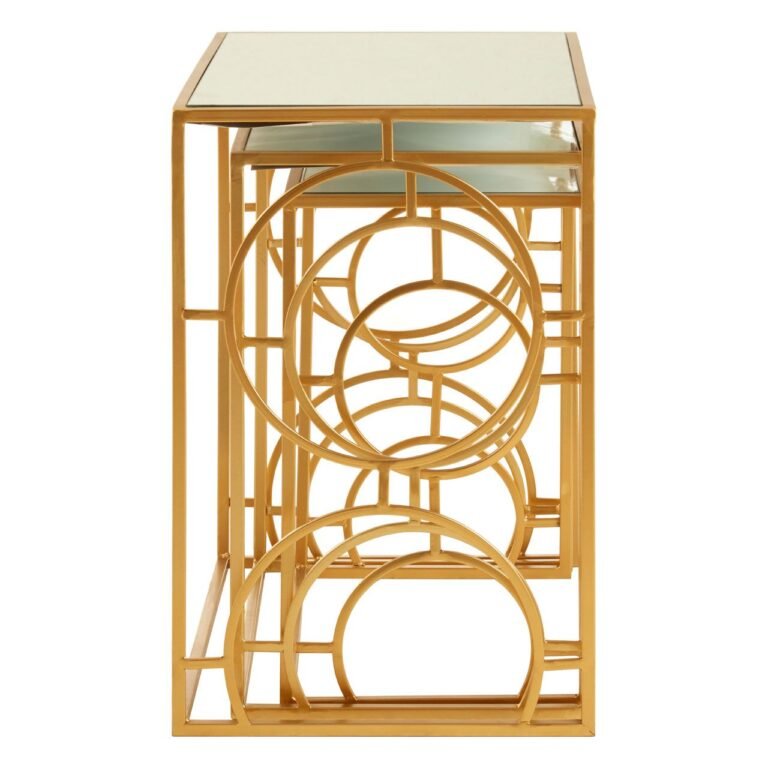 Each of these nesting tables has a robust metal base featuring a luxurious gold finish. They have rectangular frames with a circular design on each side that contributes to their decorative visual appeal. Their mirrored tops serve to amplify the reflective aesthetic. Style them with luxe-inspired furniture.
