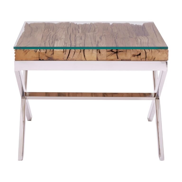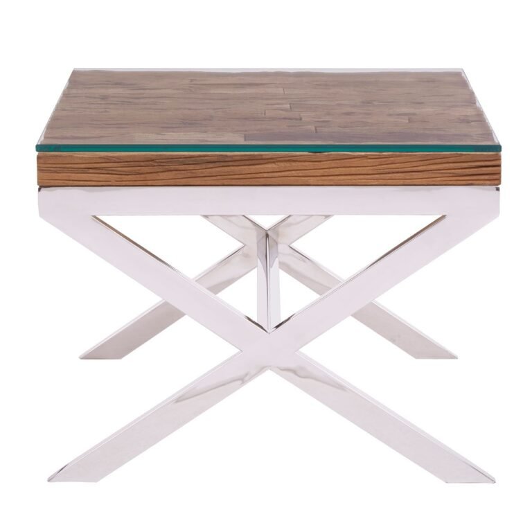 Balmoral Natural Top End Table With Cross Base: Natural salvaged wood forms rectangular top of this end table, further enhanced with the clear glass slab. The cross base in mirrored silver finish offers a tonal contrast to the natural elements and rustic texture.