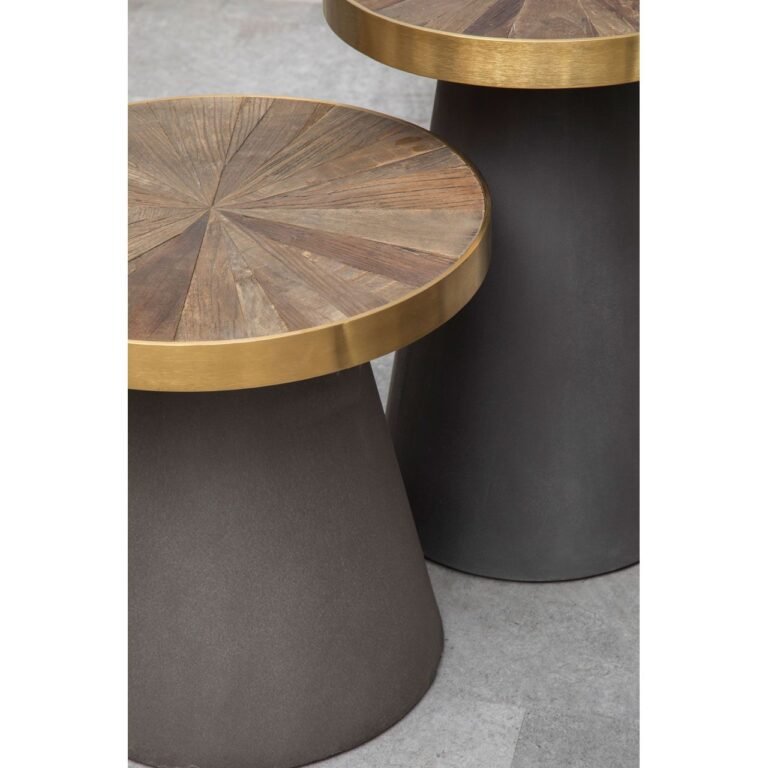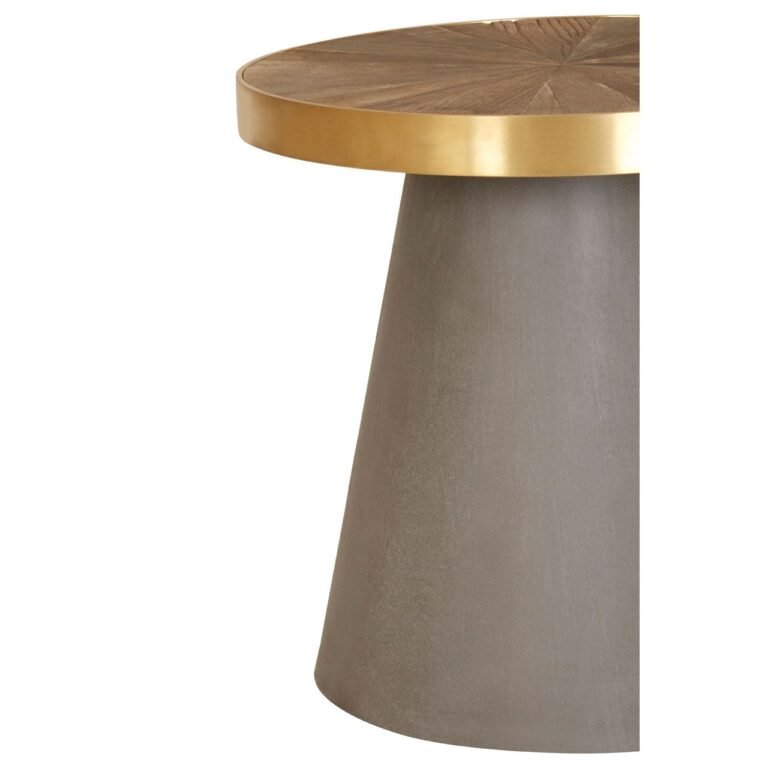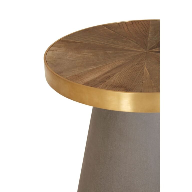 Bosh End Table With Grey Base tactile concrete base is formed into a conical shape and has a muted grey colour. The round tabletop is held in place by a band of smooth stainless steel with a brushed gold finish. Elm wood is set into the steel, its colour complementing the concrete, and its wedge formations accentuating the wood’s varied grain.