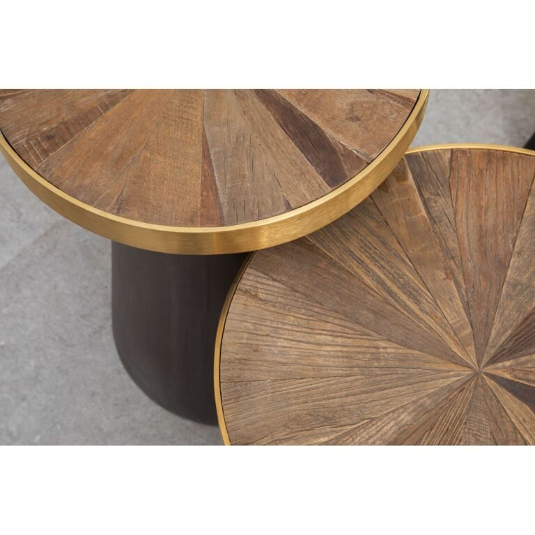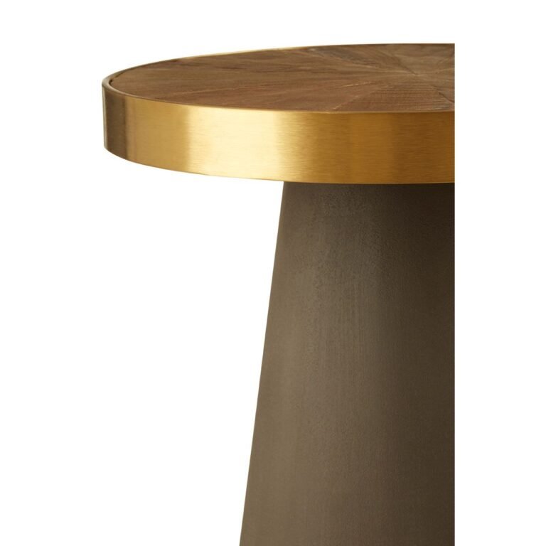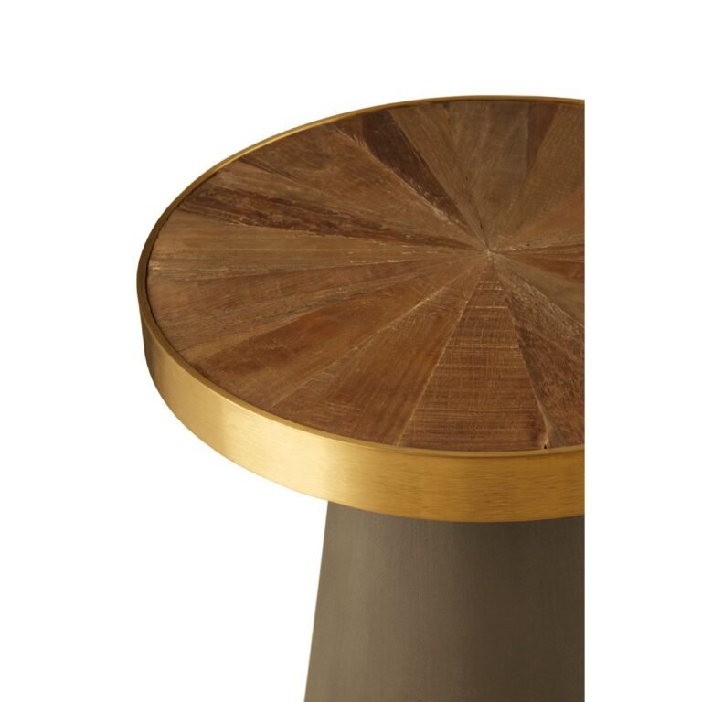 The Bosh Round End Table round top is formed from segments of sustainable elm wood, with bold grain patterns adding rich textures. The organic wood top is counterpointed by a warm gold-finish metal rim that gives the end table a touch of luxe appeal. The stylish end table’s top is supported by a black concrete base that tapers upwards.