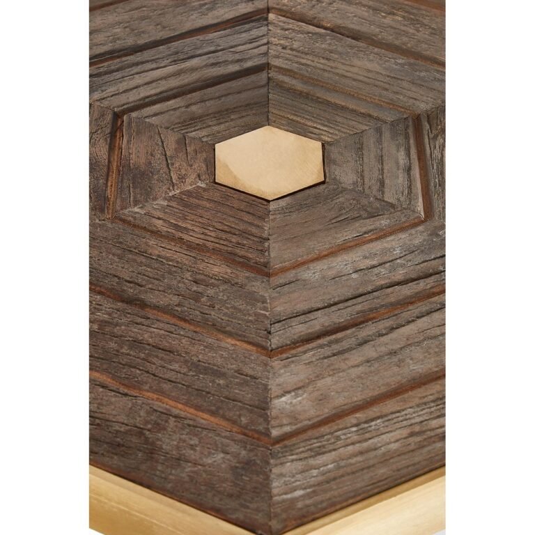 Bosh Small Hexagon End Table: The polygonal pedestal has a rich gold colour which has a brushed finish for a textured look. Set into the top is a single piece of elm wood, with a grooved design that accentuates its hexagonal shape. The eye is drawn towards the centre where a hexagonal piece of gold coloured stainless steel is positioned.