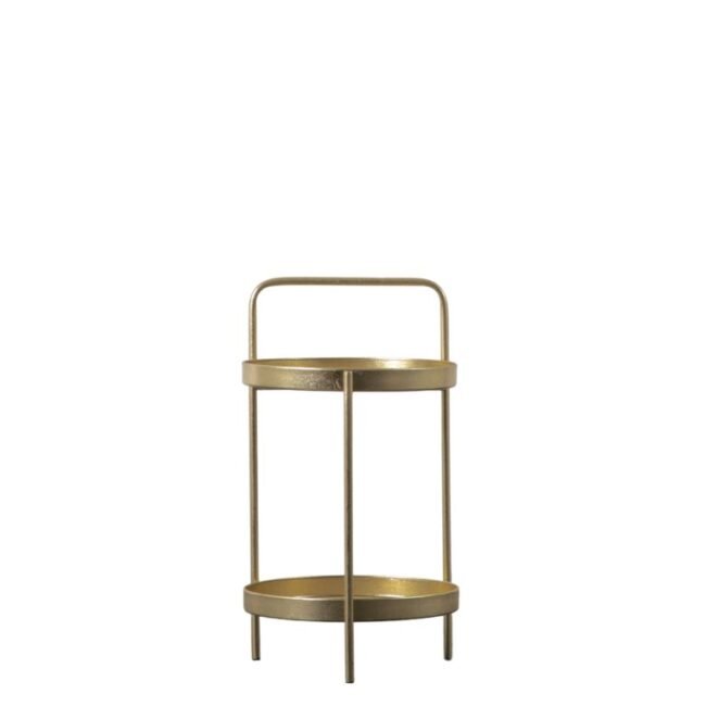Contemporary side table crafted from metal carefully finished with a hand applied ragged gold leaf finish, with a tray-style top and lower shelf. The stunning design features a continuation of one section of the base, up and over the table to create a ‘handle’ effect. A matching coffee table is available in the gold leaf finish, and both are also offered in a black finish.