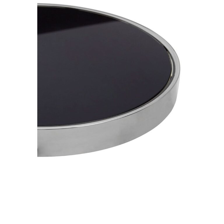 The contemporary Eaia Side Table With T-Shaped Base is designed with a unique T-shaped base created from strong steel. Finished in an elegant metallic silver colour, the right-angled base is counterpointed by the table’s rounded top. Created from tempered glass, the tabletop features a sleek black finish to contrast with the cool metallic body.