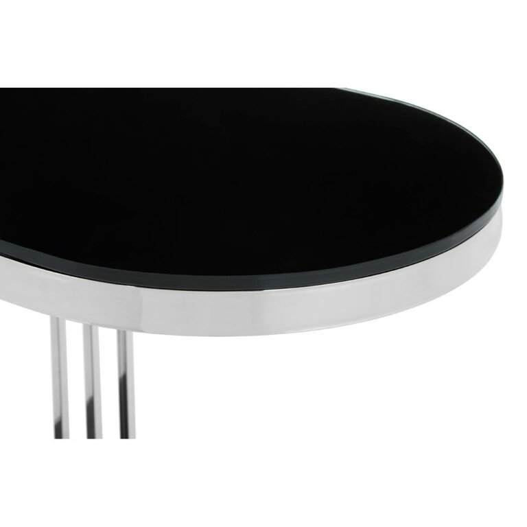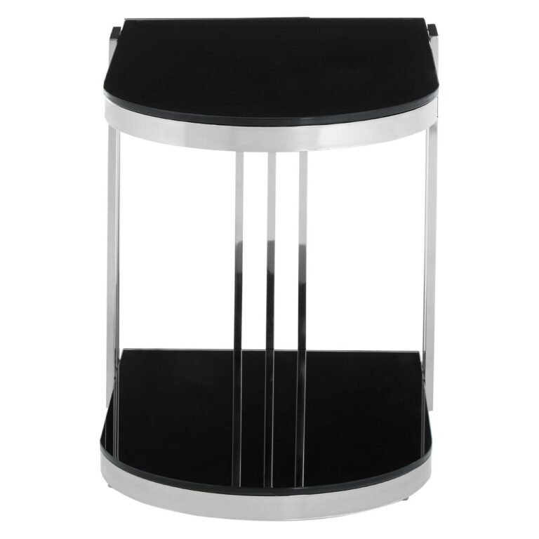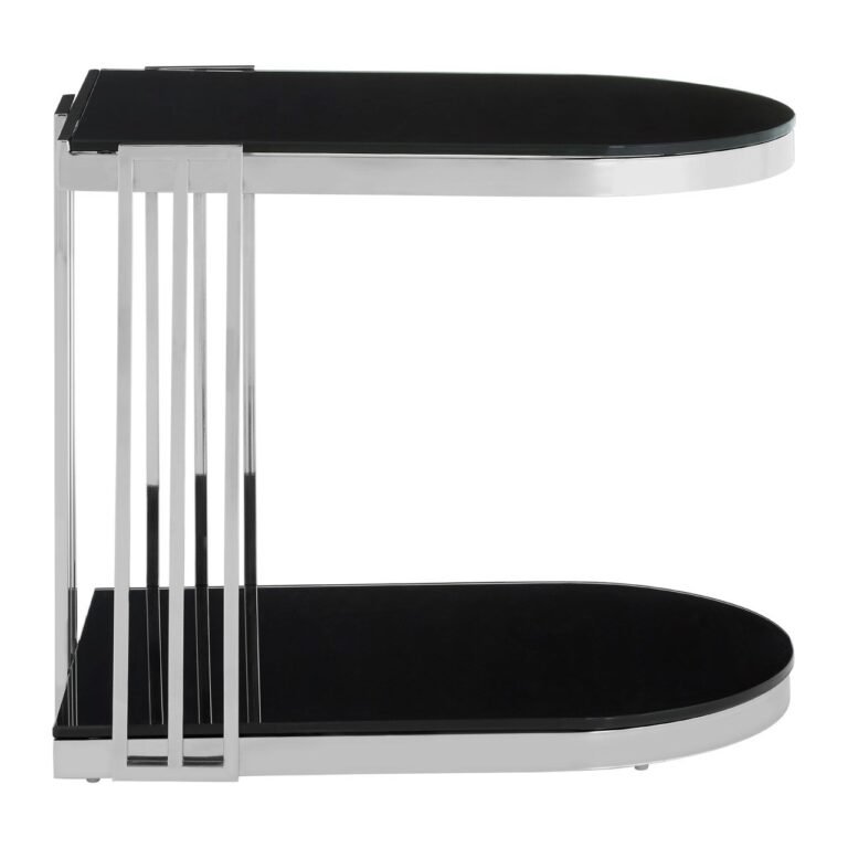 Eaia Silver / U-Shaped Side Table: The side table’s minimal frame is formed from smooth steel, with a trio of slender metal bars creating the back and sides. The U-shaped base and tabletop are formed from tempered glass with a sleek black finish to counterpoint the reflective metallic frame. Coordinate with cool metallic lighting and accessories for a cohesive look.