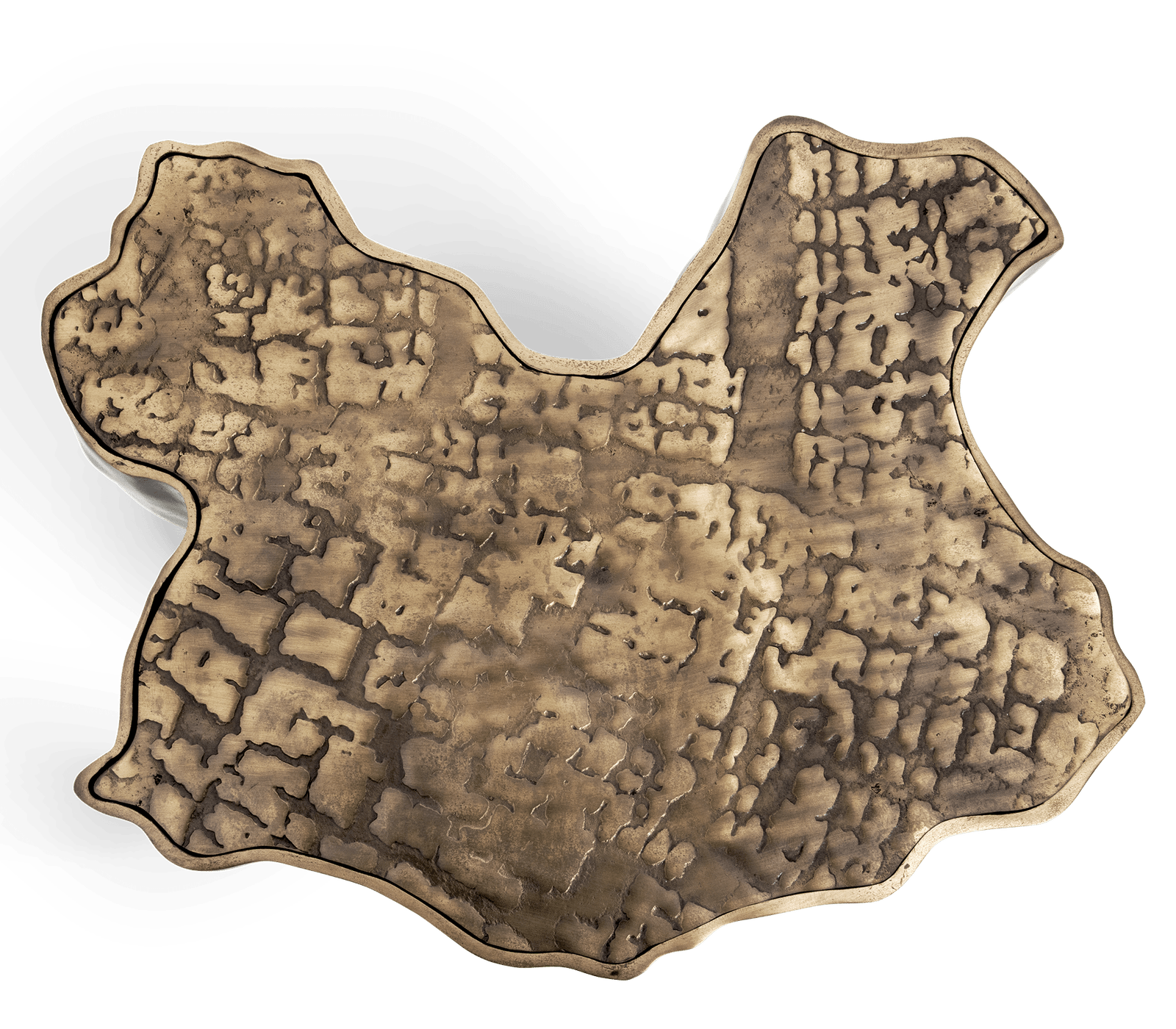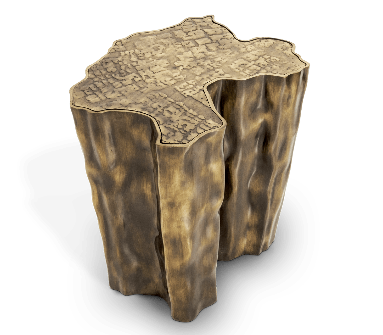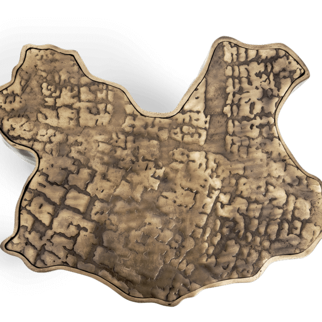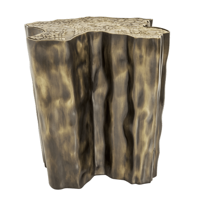 Eden Patina Side Table: Eden is inspired by the mystic behind the name. This side table represents a part of the tree of knowledge and the tale of the birth of desire. Fully made of polished casted brass, with a delicately engraved top exposing the heart of a golden tree to the very heart of a home. Available a set of two side tables and also an elegant and highly decorative side table.