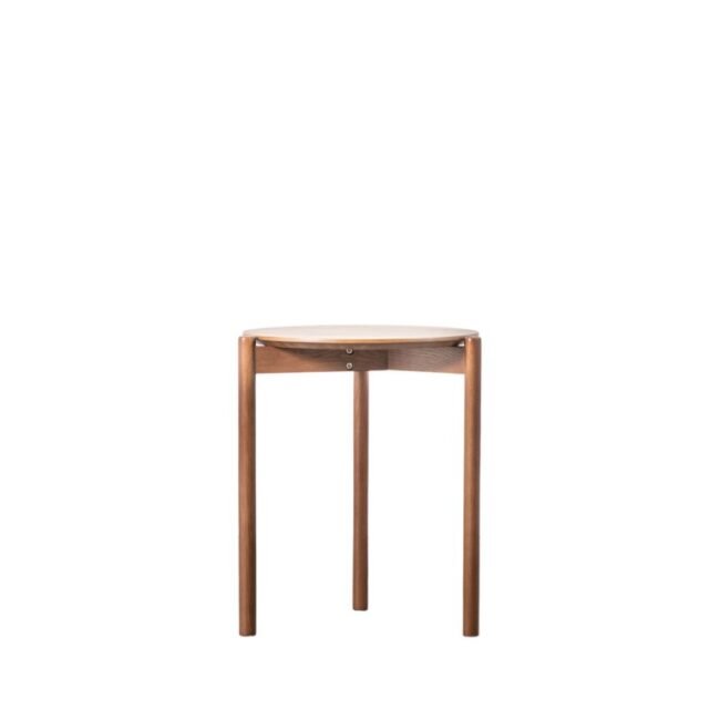 Stylish side table offering a simple yet stunning design. The circular top is crafted from walnut veneer and sits on the solid oak base, which is stained to match the top, with the ends of elegant round legs showing to echo the shape of the top. A matching coffee table is available, and both are also offered in a black and an oak finish.