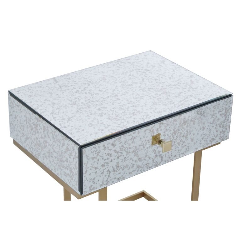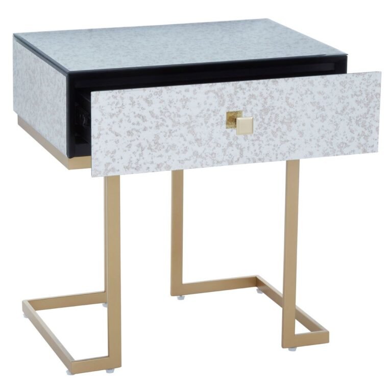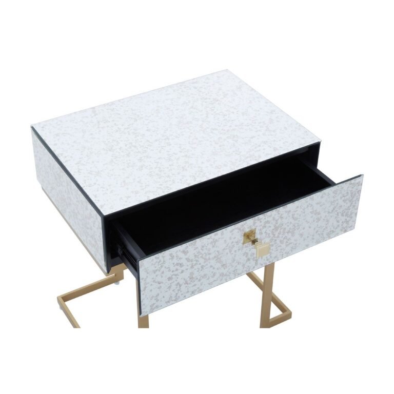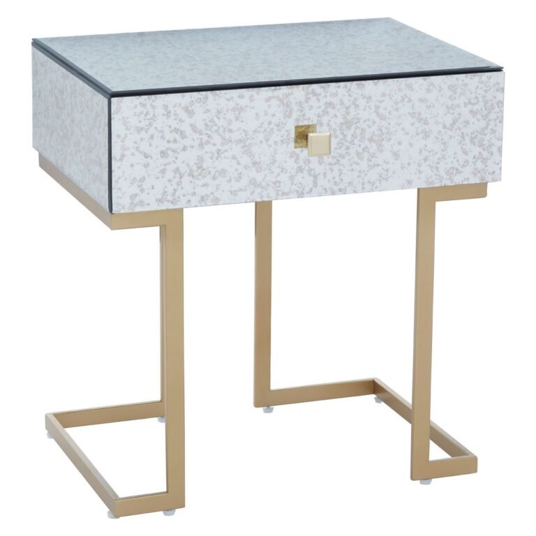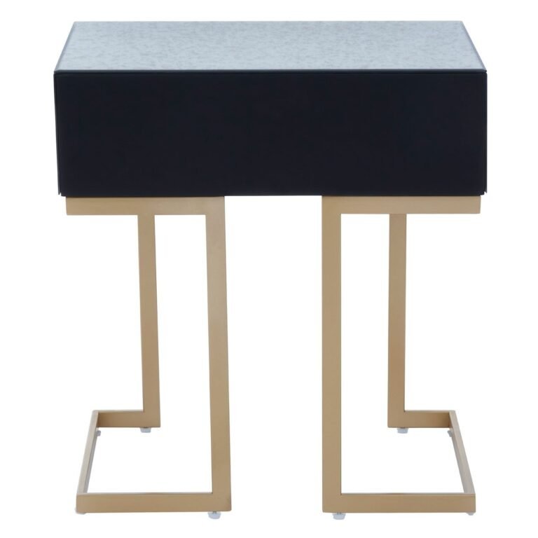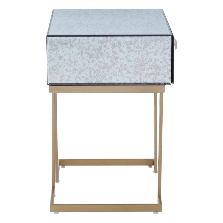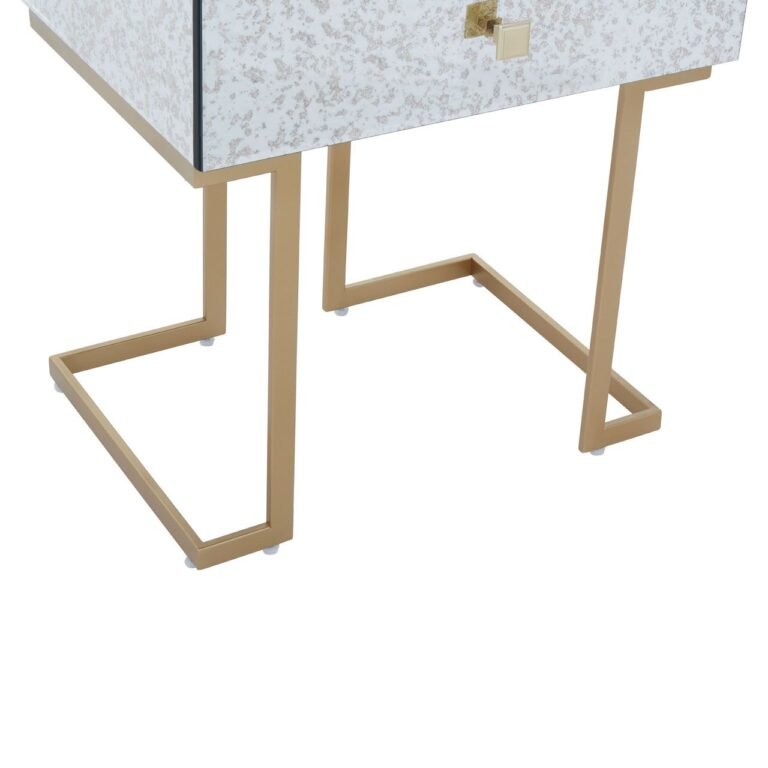 Made from iron, this Ersim End Table has C-design sledge base in the brass finish. The sculptural base is topped with antique glass in distressed effect featuring a single drawer with the warm metallic knob handle.