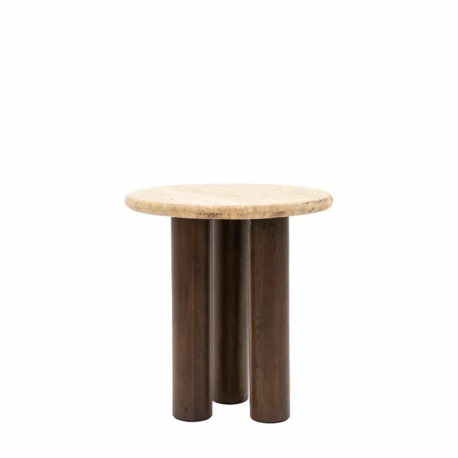 With its chunky turned cylindrical legs, crafted form mango wood solids, and solid travertine stone top which has a natural finish, this stunning side table offers a dramatic eye-catching look. Matching pieces are available.