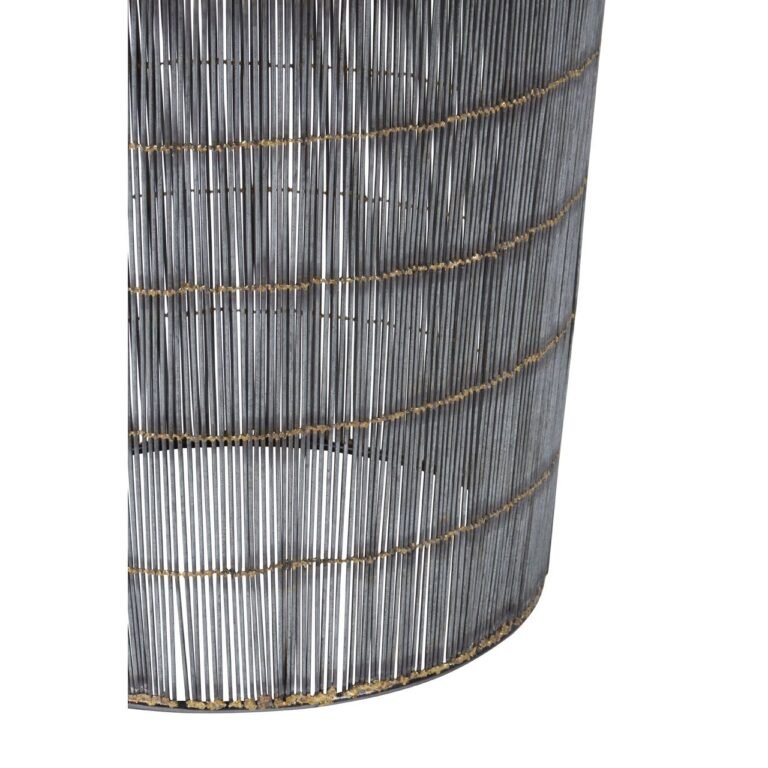 Foxley Natural Wireframe Side Table: This drum-shaped side table is formed from a myriad of slim iron wires, designed to resemble natural bamboo. The iron has a muted silver colour which is given warmth by gold coloured lines on the side, and concentrically at the top. This stylish accent piece adds a metallic touch to boho-inspired interior design settings.