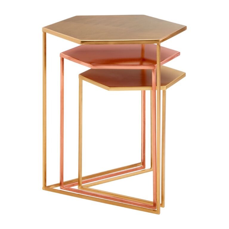 Foxley Set Of 3 Bronze Finish Tables; Each of the three table’s boasts a variation of a warm metallic finish; gold, brass and bronze. The tables’ hexagonal top and geometric, angular frame lend them a contemporary aesthetic.