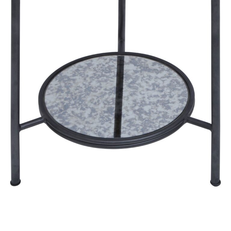 Franny Two Tier Side Table: This side table has a round table top made from antique mirrored glass, with a matching lower shelf for open storage. The two tier design in a rustic effect forms a bold contrast with the minimal metal frame in black and silver finish.