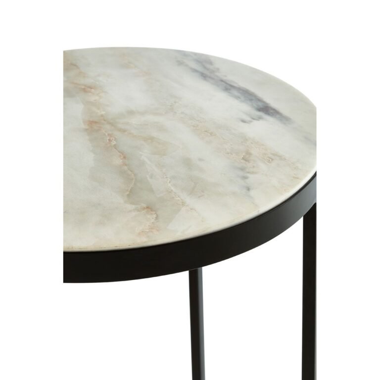 The legs of the Gaic Black Cross Base Side Table are made from iron, and have a minimal design that intersects at the base. A single piece of round marble is set into the top frame to provide this accent piece with a luxurious finish. The marble is patterned by subtle wisps and veins, adding a touch of colour to its milky white surface.