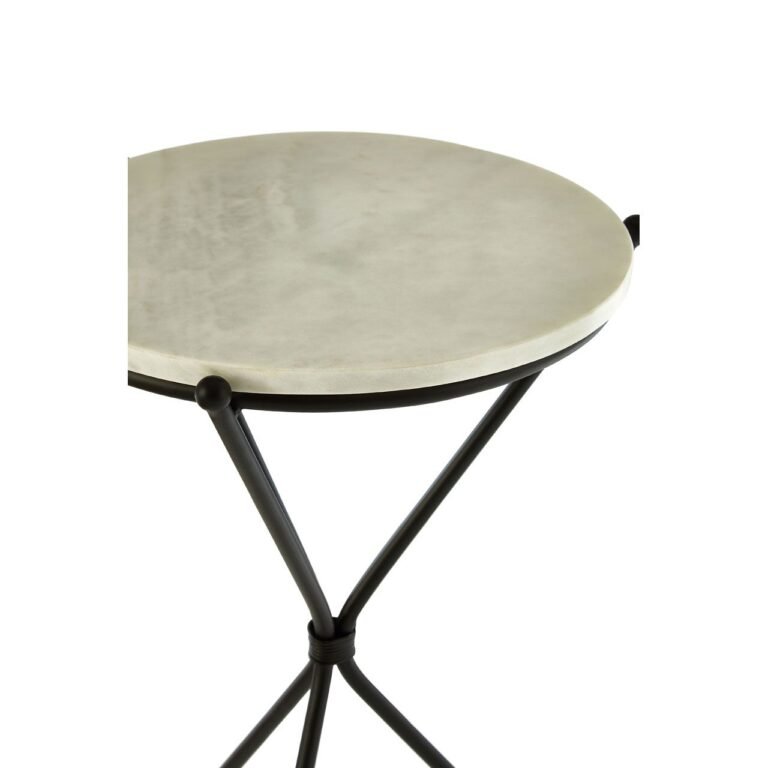 The Gaic Black Tripod Base Side Table features a round white marble top with subtle veining providing tonal contrast. The luxurious tabletop is cradled by three black iron legs creating an hourglass shape, with a band of matching black iron binding them at the centre. The trio of legs have a tripod formation for stability. Display with warm metallics to add luxe appeal to any living space.