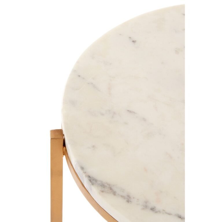This Gaic Marble/Gold Round Table uses a circular slab of natural marble for a tabletop. It rests upon an iron base, with the table’s three legs extending upwards to cradle the smooth white surface area. The legs conjoin directly underneath the marble to form a stable base for this boutique hotel-style table.