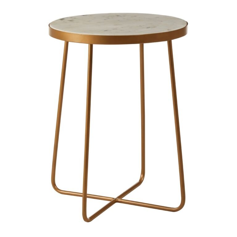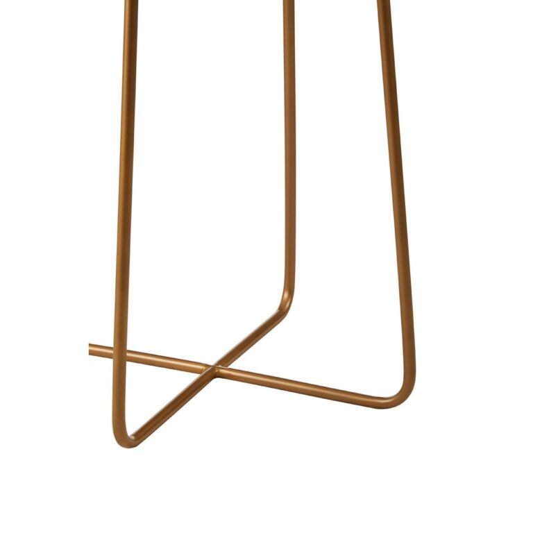 The Gaic Round Side Table With Cross Base stands on minimal legs made from smooth iron with a gold finish that styles well with warm metallics. The legs intersect at the base to produce a flowing silhouette. Set into the top is a round slab of white marble, its darker wisps and flecks creating a subtle pattern. The marble lends a tactile finish to this contemporary piece.
