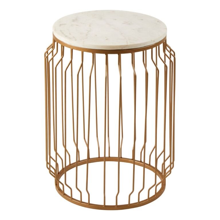This Gaic Round Side Table With Wireframe Base has simple lines which form a symmetrical cage design in a luxe gold finish. A cool white marble top with mild veining neatly sits at the top and coordinates with the open ring bottom. Designed for a contemporary urban space, style this elegant table next to a clean-lined sofa.
