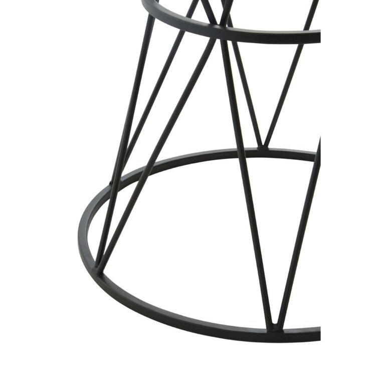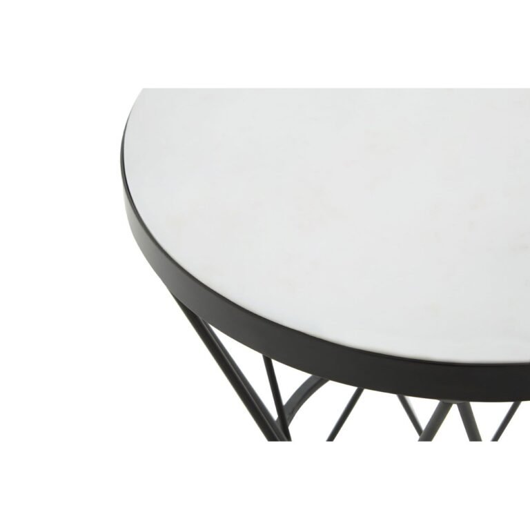Gaic Round White Marble Top Side Table: Circles and triangular shapes enhance openwork metal base of this side table. The white marble top neatly rests in the round table top and forms a monochrome contrast with the black finish angular lines.