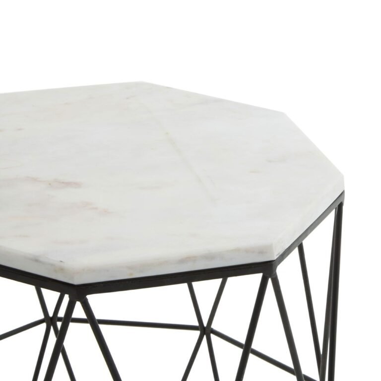 Gaic Side Table With Octagonal Top: Sturdy black finish iron lines gently mould to create the angular frame of this side table. The sleek lines combine to create a geometric shape complete with a smooth white marble piece that is inset in the octagonal top.