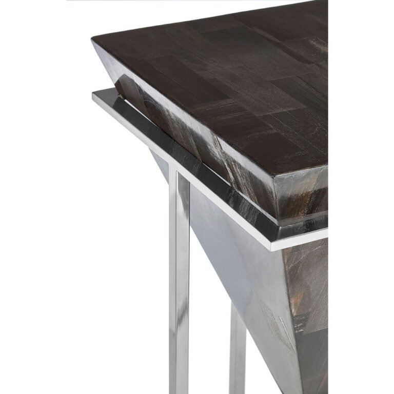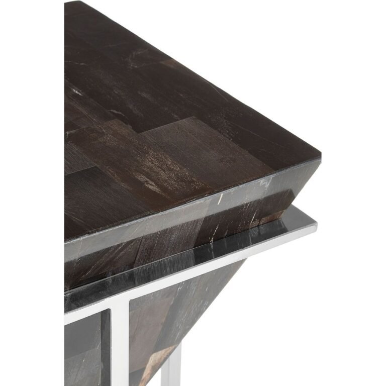 The Guise Large Dark Petrified Wood Side Table geometric frame is made from stainless steel, its cool reflective finish lending a touch of luxury. In the centre of the intersecting base sits a sphere created from dark petrified wood, coordinating with the table’s top. The smooth, rounded form counterpoints the pointed upside-down pyramid shape that forms the tabletop. Prominent graining on both pieces of wood creates distinctive patterns on their surfaces.