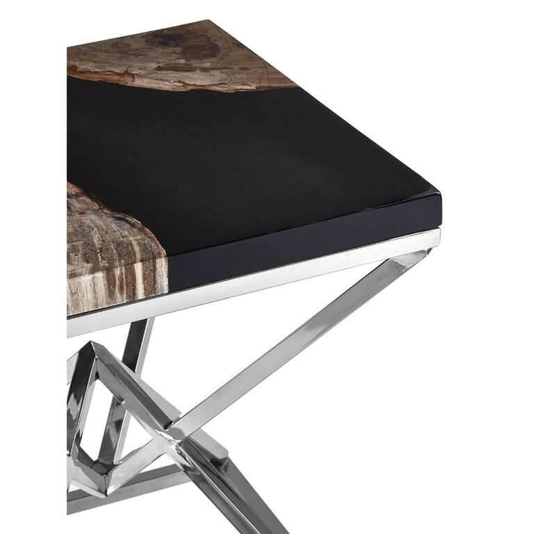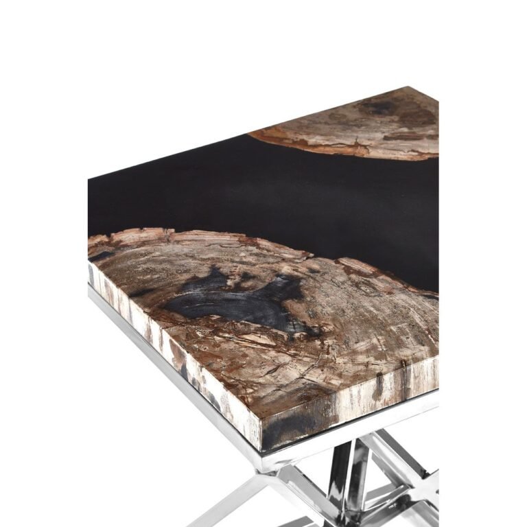 Guise Petrified Wood Side Table square top is made from petrified wood, which has been fossilized over millions of years, preserving its characteristics while turning it into stone. The wood’s natural elements come through at each corner, with a black section in between for contrast. Resin is applied at the finish. Geometric stainless steel legs contrast the black and natural colours.