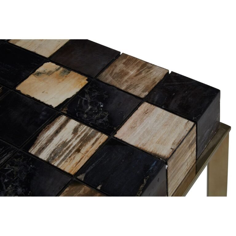 Guise Side Table With Brass Finish: Crafted from petrified wood fossils, this tabletop brings warmth and character in individually carved wooden blocks, formed into a checkerboard pattern, in black and natural hues. Brass finish stainless steel legs extend to combine and form a cross-leg base, adding to the geometric element.