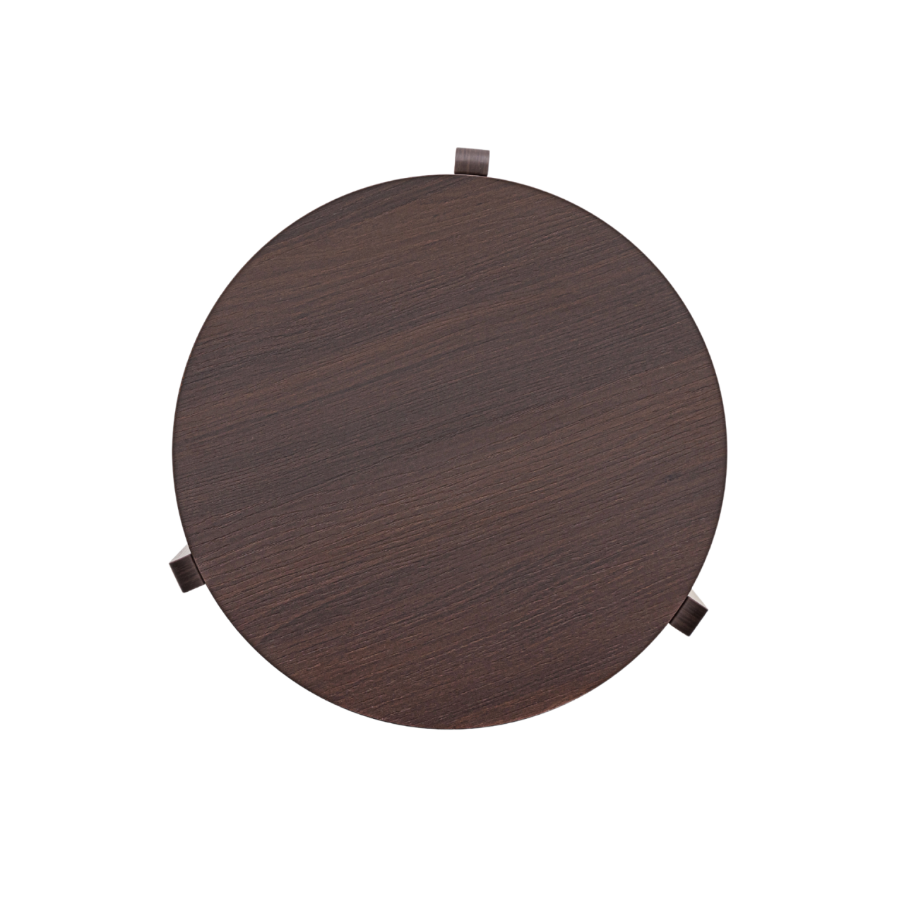 The Halo Side Table combines modern minimalism with symmetry and dynamic design. The top is circular and features a woodgrain finish. The three rectangular legs have rounded edges and protrude to overlap the top, creating a striking visual effect. Designed with durable materials, it is a sustainable and stylish addition to any interior.