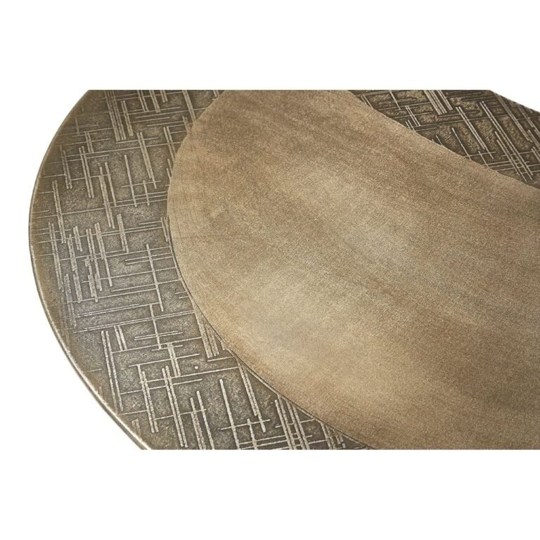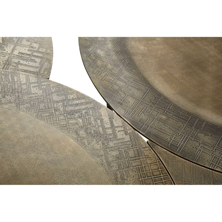 Hamy Set Of 4 Coffee Tables: Two circular tops are paired with a crescent and teardrop shaped partner. The antique brass colour is patterned by scores on their outer sections. Each table is supported by hairpin legs made from black iron.
