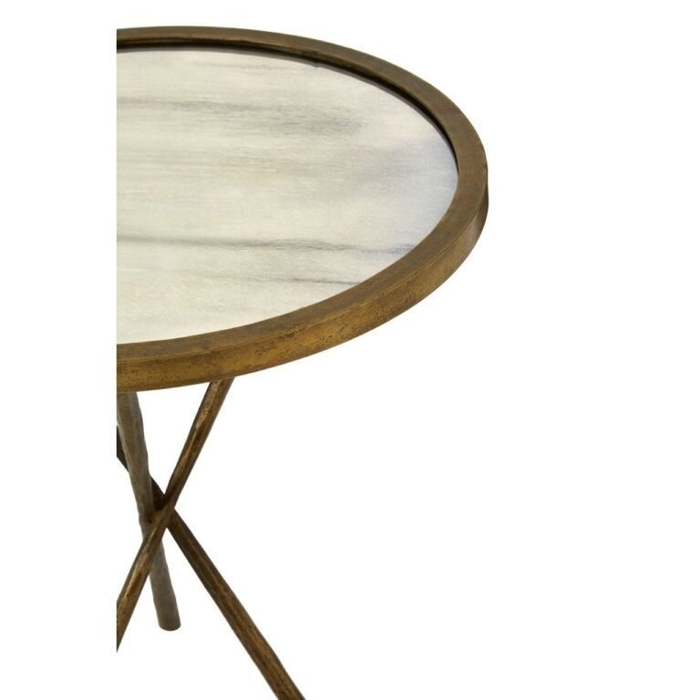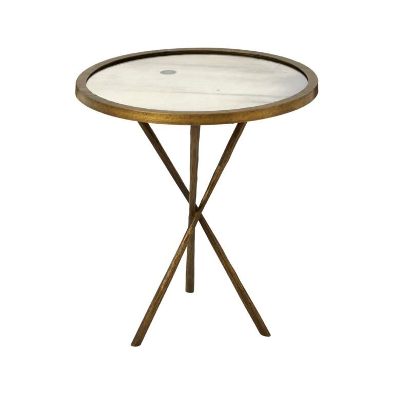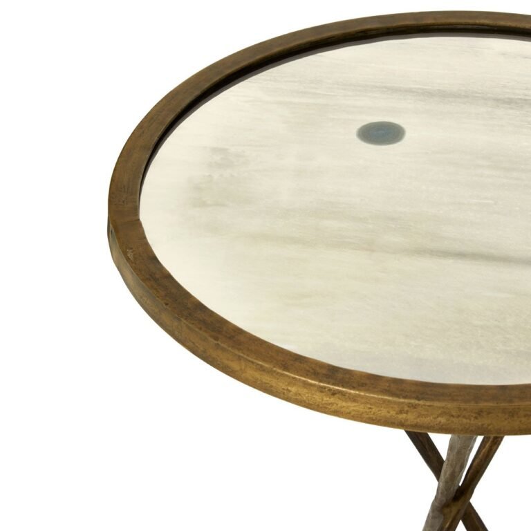 Hamy Small Round Side Table: Its three legs and frame are made from durable iron and have an antique brass finish. Antiqued glass is set into the top to add to the table’s weathered appeal. Coordinate it with warm metallic accessories.