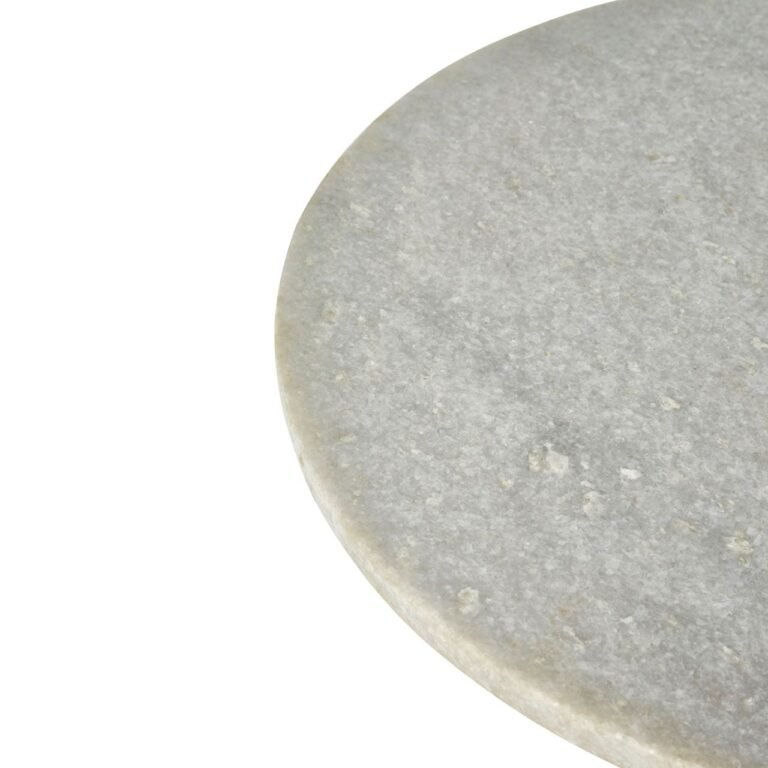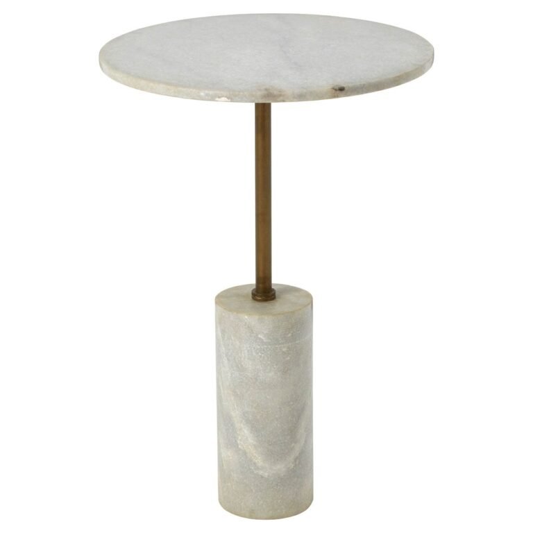 The Hamy White Marble Top Side Table cylindrical base and round top are both crafted from solid marble. The marble has a white colour with delicate black veining creating a textured look. A simple iron pole completes the structure, coloured antique brass to complement the black.
