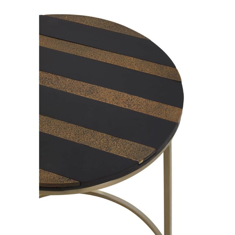 This side table features a round acacia wood top adorned by black and gold stripes. The table is supported by a minimalist aluminium frame in a gold finish, creating a modern aesthetic.