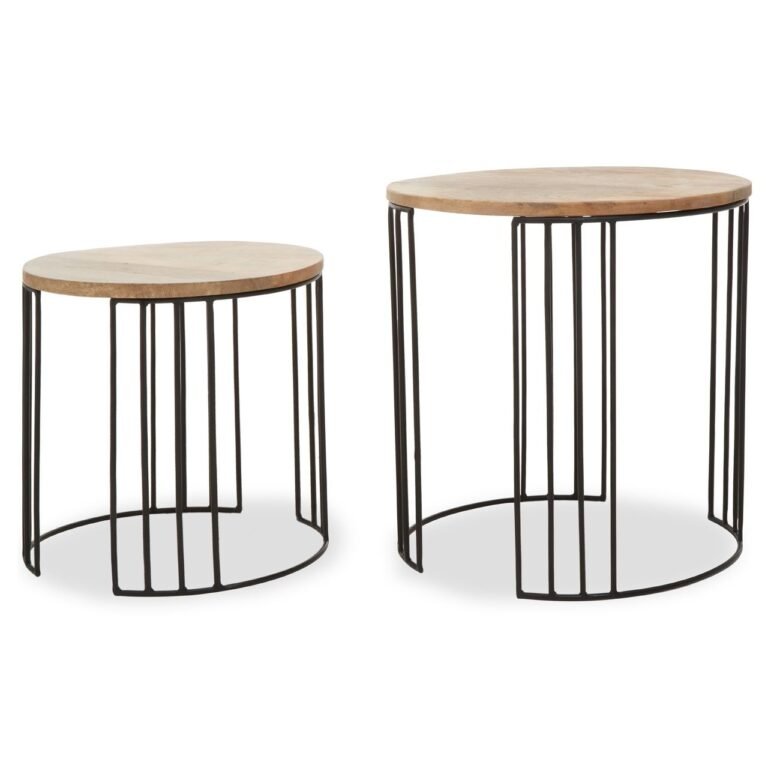 Kenton Set Of 2 Mango Wood Side Tables: This set of two side tables will add rustic charm to the interior. The renewable mango wood top in a round shape sits neatly on a sturdy iron frame. The drum-shaped linear metal fixture in the black finish has a round base for added support and style.