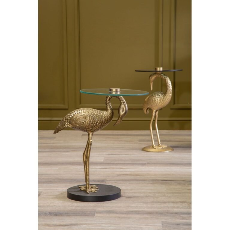 The Lambton Clear Glass Pelican Side Table features a pelican sculpture in the warm metallic finish. A clear glass round top is neatly fixed over it that coordinates with the black base of the side table.