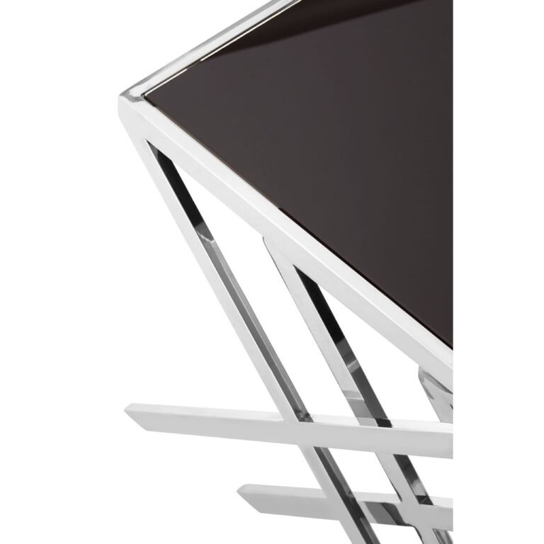 The metal frame of each table is designed in a minimal cross formation and each one boasts a reflective chrome finish. Counterpointing the cool metallic frame is the square tempered glass top that is sleek black in colour.