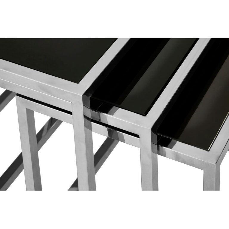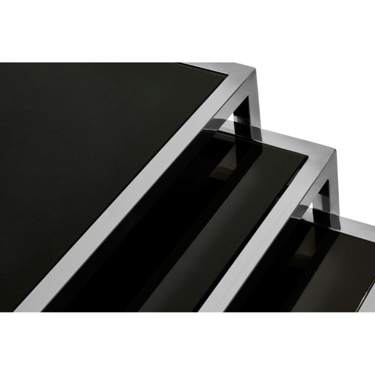 The Langley Set Of 3 Nesting Table has a frame made from sleek stainless steel, with a chrome coating for a reflective finish. Their tops are made from tough tempered glass and have a black finish that combines with the steel to create a monochromatic effect. The nesting design makes them ideal for buyers looking to create additional surface space in smaller interior settings.